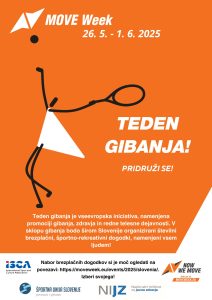 Vabimo vas k udeležbi na številnih brezplačnih dogodkih v okviru mednarodnega TEDNA GIBANJA (angleško: MOVE WEEK) 2025, ki uradno poteka od ponedeljka, 26. maja do nedelje, 1. junija 2025. Gre za vsakoletno vseevropsko pobudo, ki je sestavni del kampanje Sedaj se gibamo (angleško: NowWeMOVE), katere namen je promocija telesne dejavnosti za krepitev zdravja. Priporočamo ogled videoposnetka v angleščini o zgodovini in pomenu kampanje.